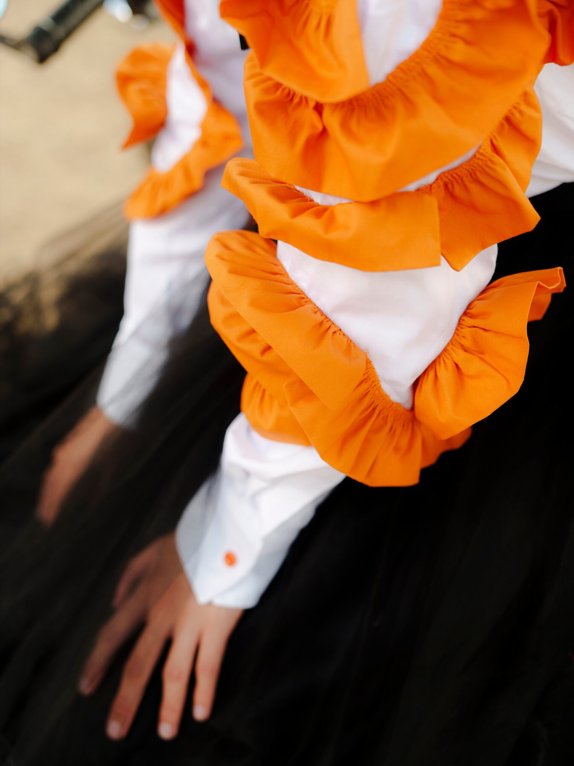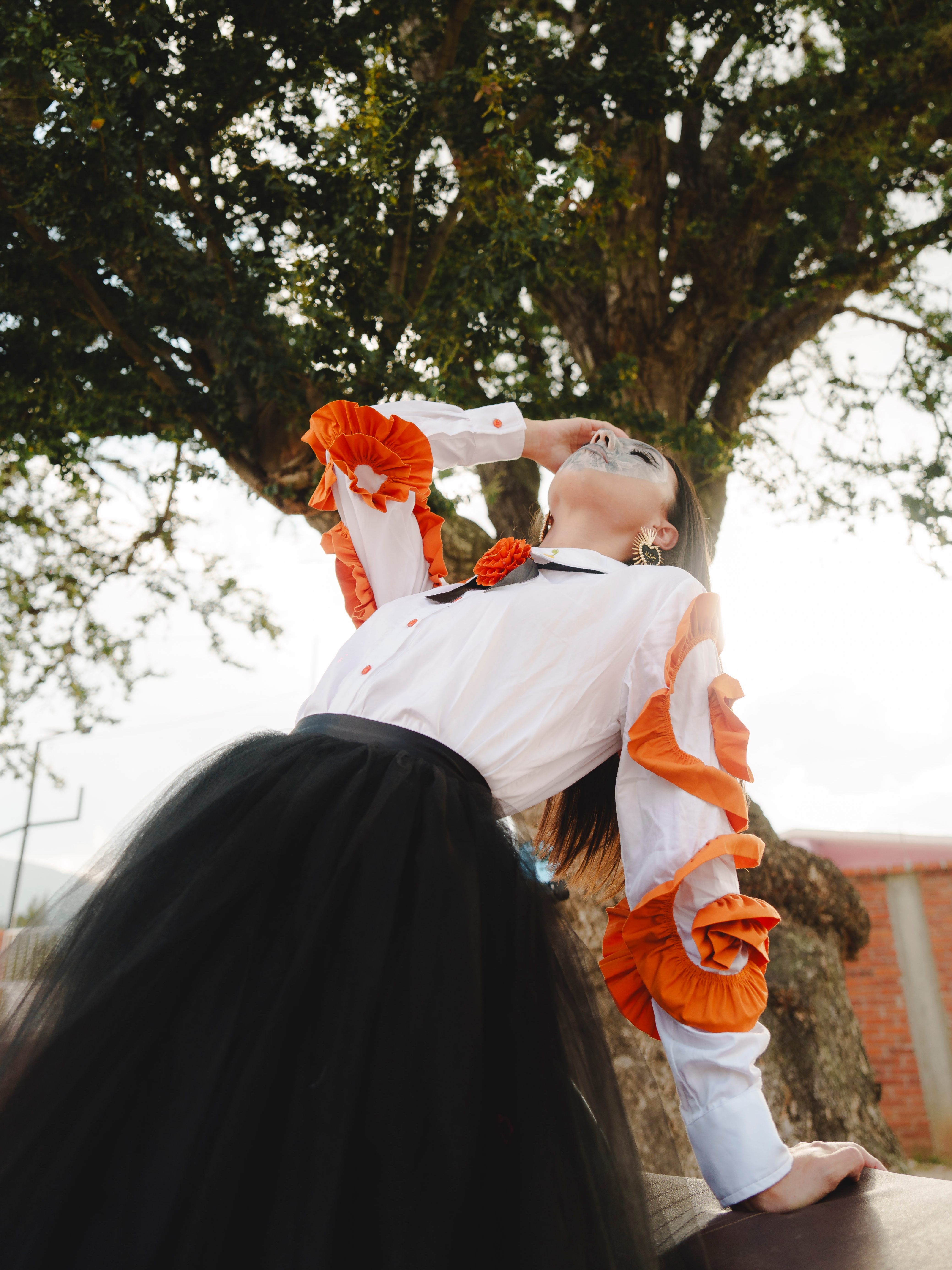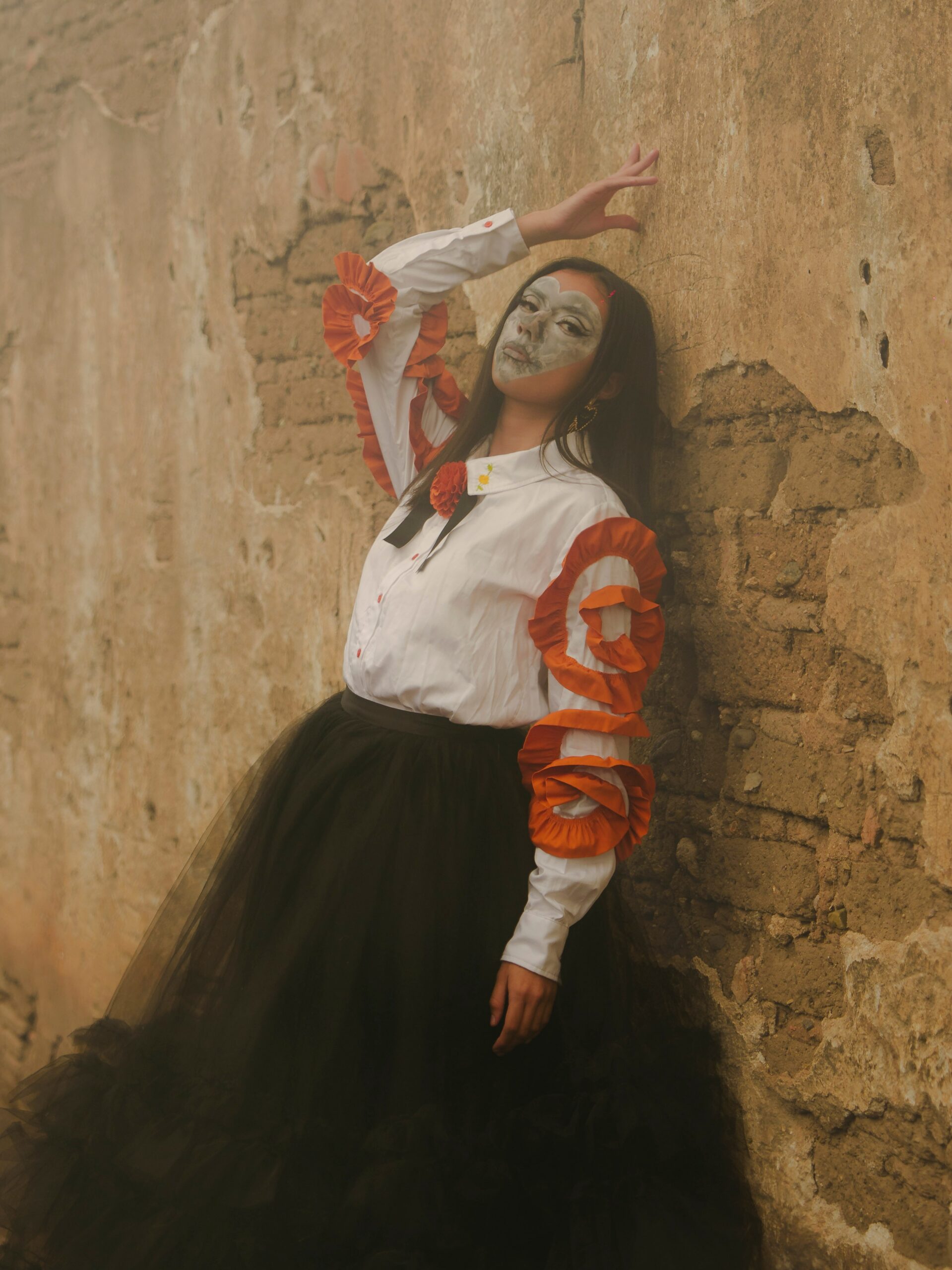 Blusa manga larga color blanca hecha de popelina de algodón con 3 flores circulares en la manga hechas de olanes en color naranja. Botones y cuello camisero. En este ultimo se bordan dos flores de cempasúchil.