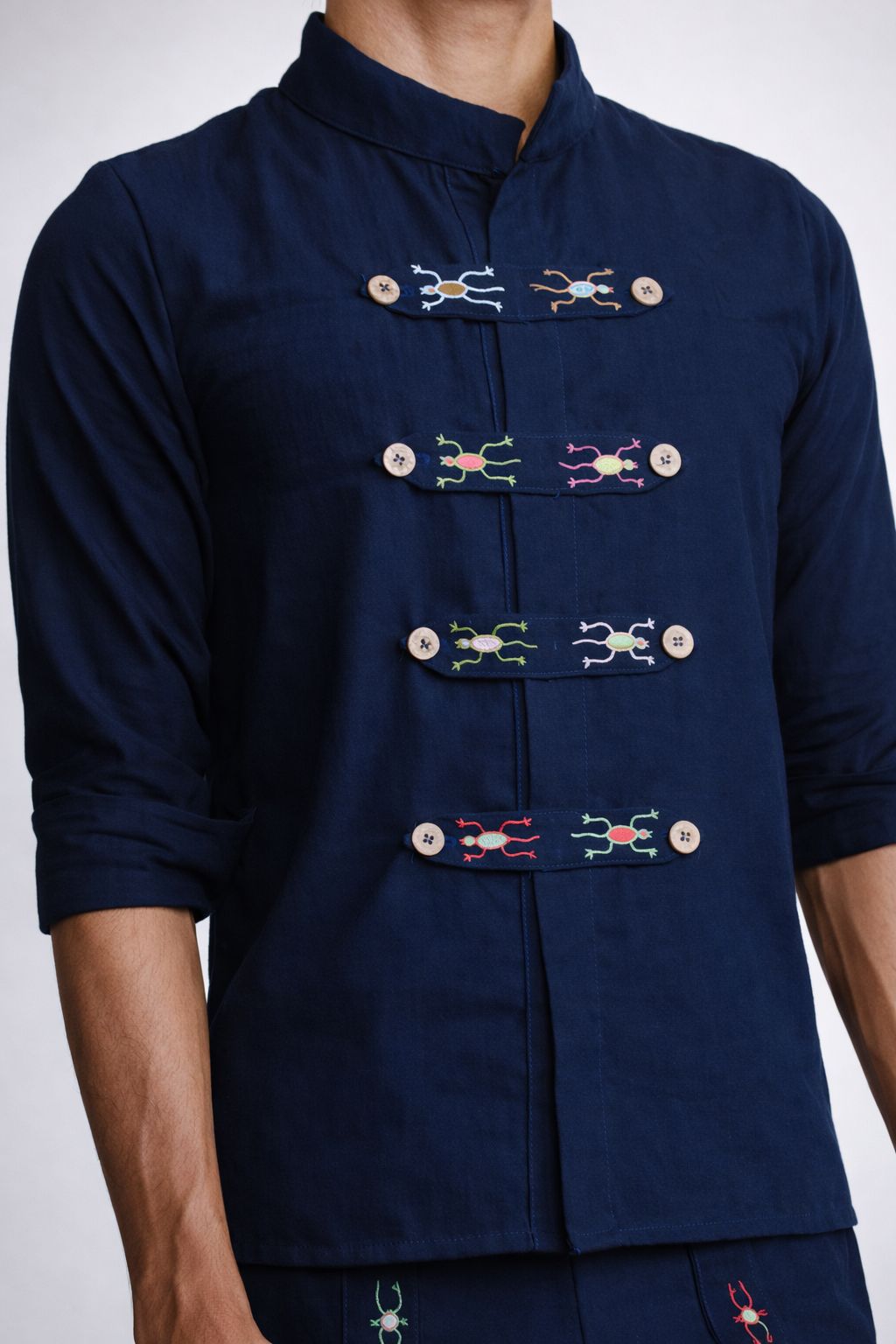 Camisa de variación de lino con manga 3/4, cuello mao y cuatro charreteras bordadas con iguanas de colores. La complementan botones de jícara labrada.