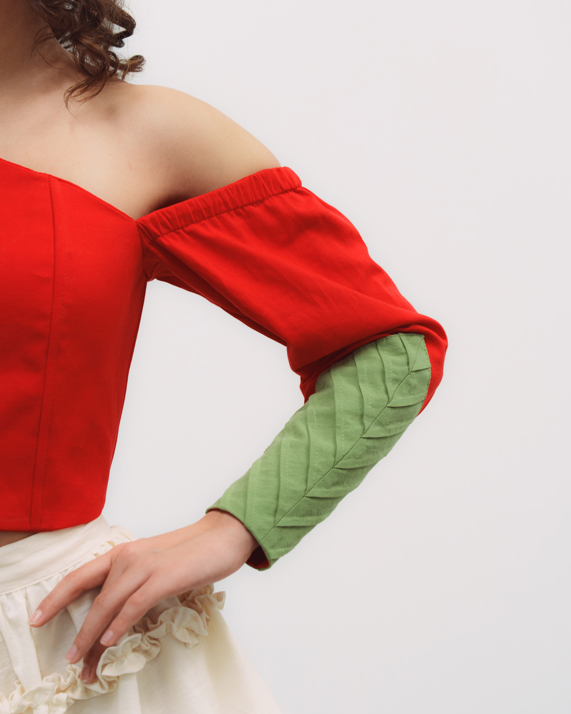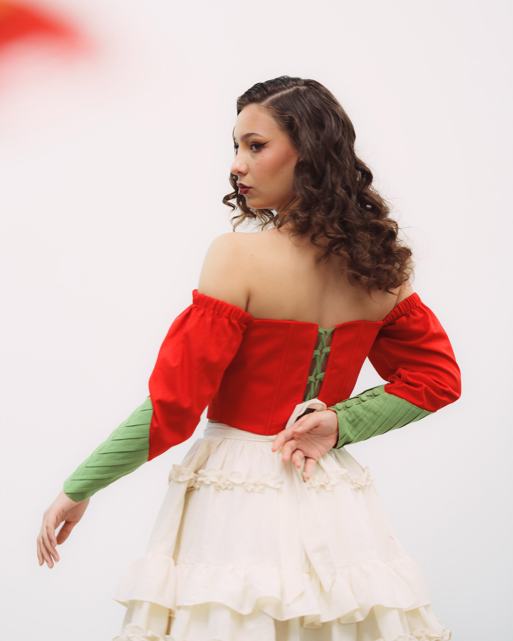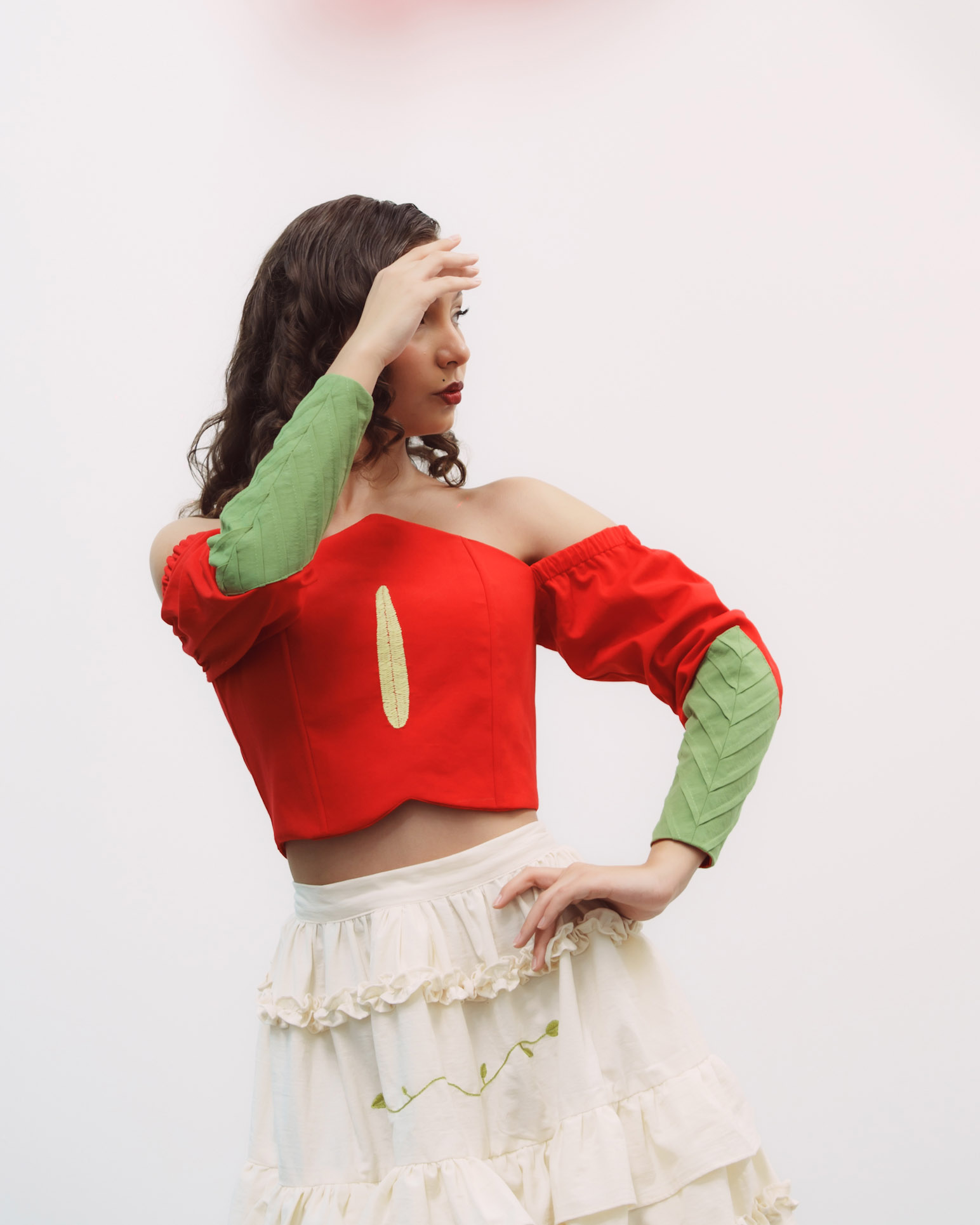 Corset hecho de manta de algodón color rojo, con corte característico, un bordado en tono amarillo en el centro, y nuestras alforzas distintivas en las mangas en color verde que simulan una hoja.