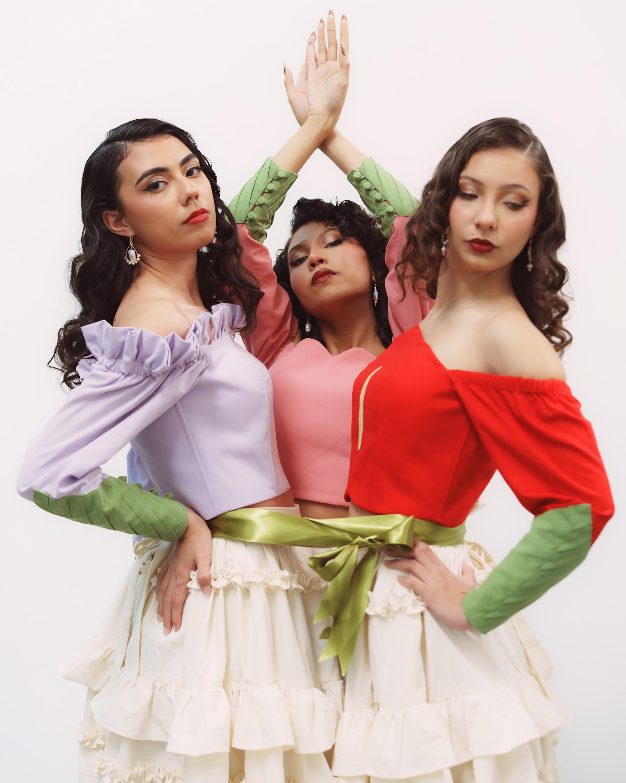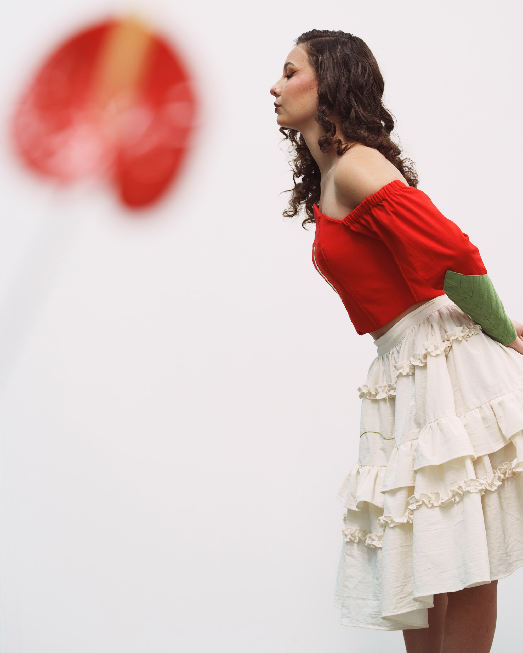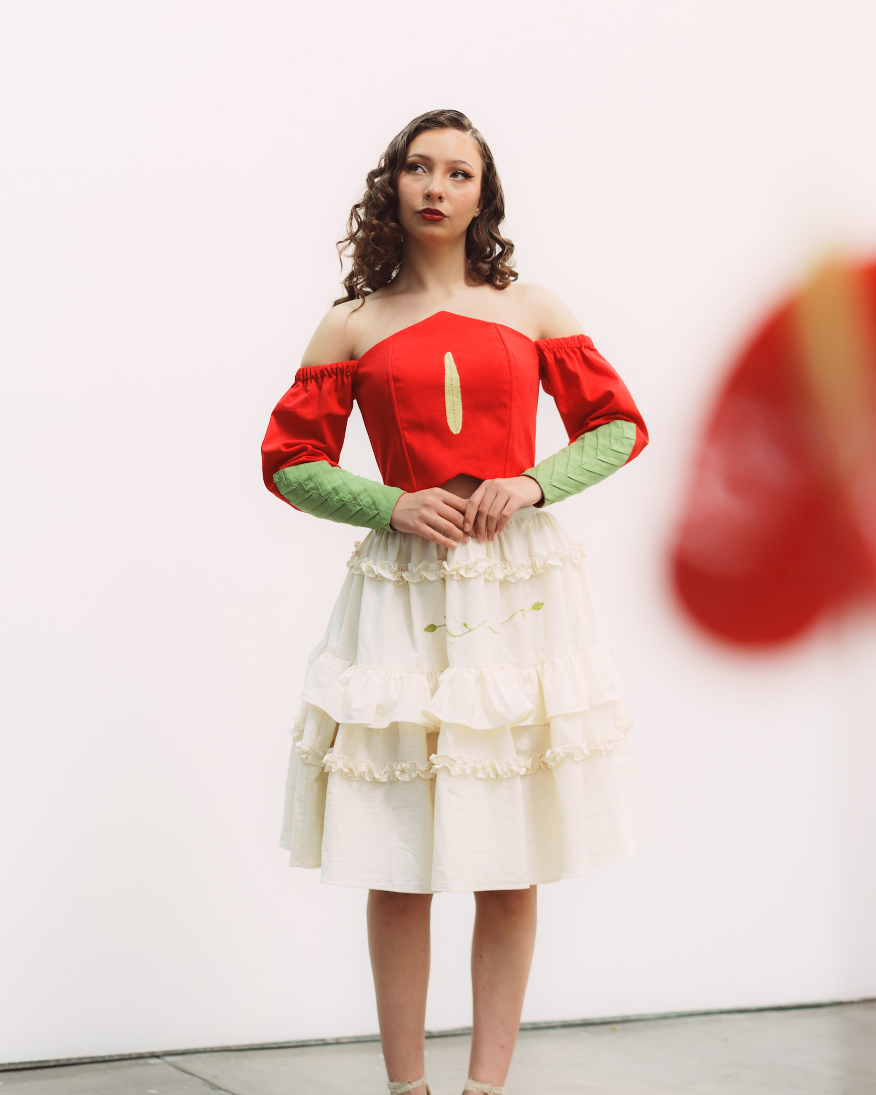 Corset hecho de manta de algodón color rojo, con corte característico, un bordado en tono amarillo en el centro, y nuestras alforzas distintivas en las mangas en color verde que simulan una hoja.
