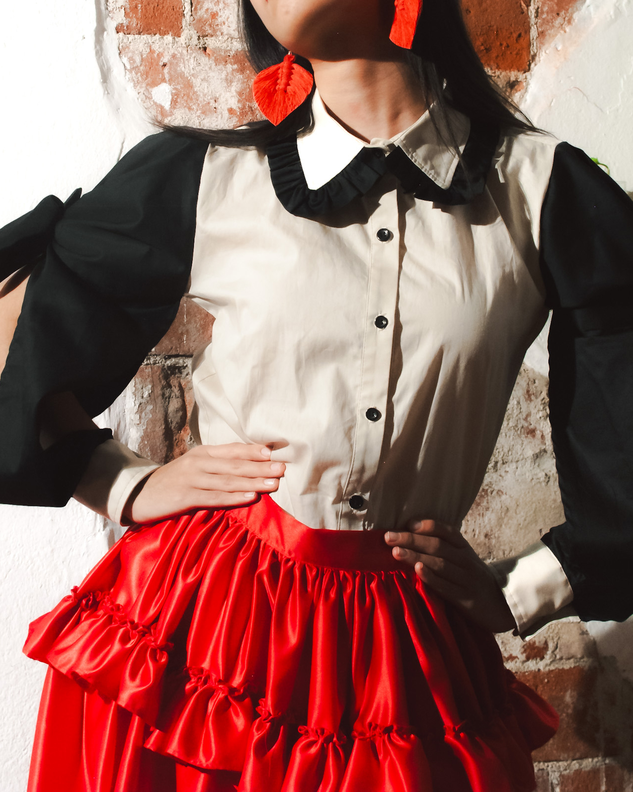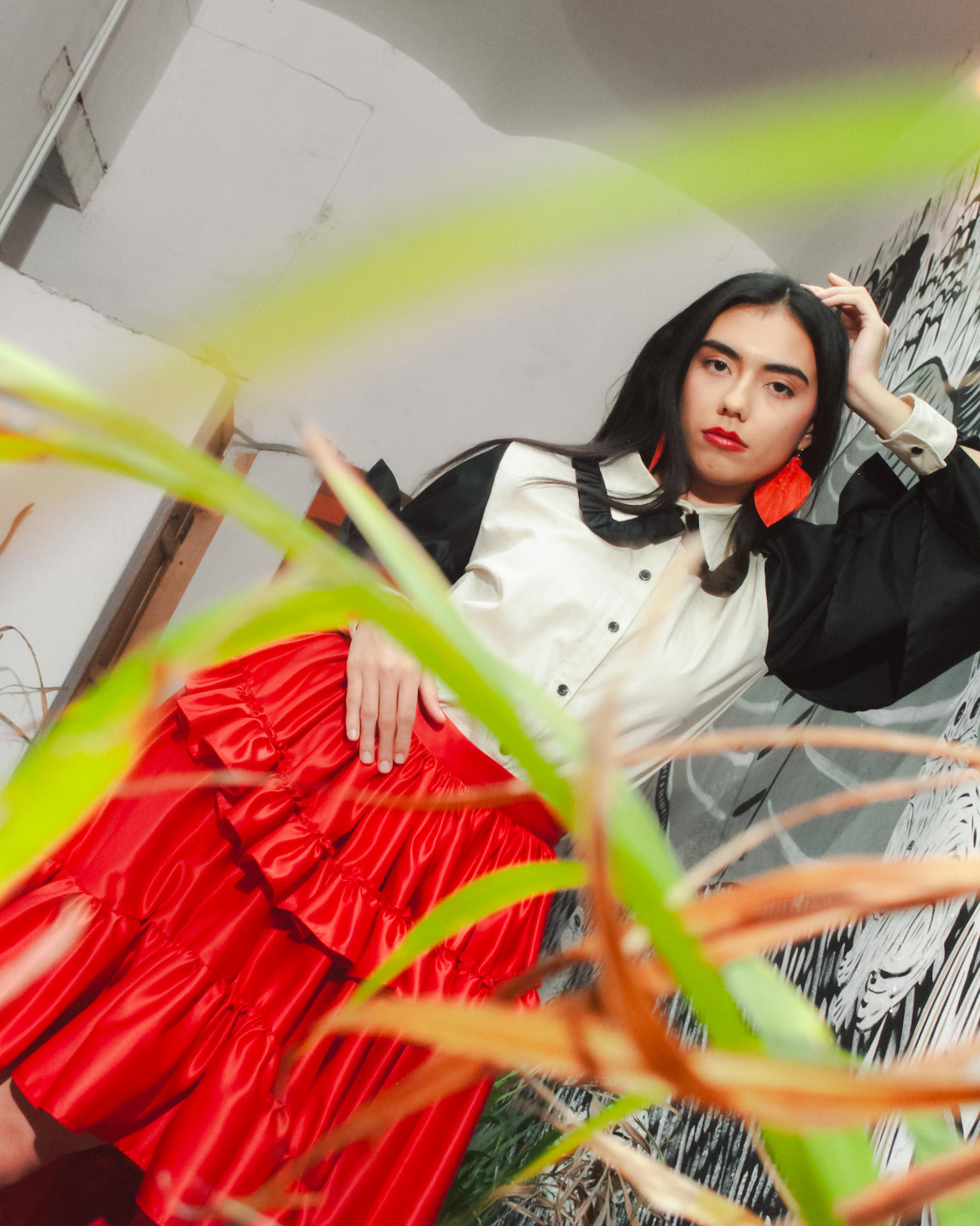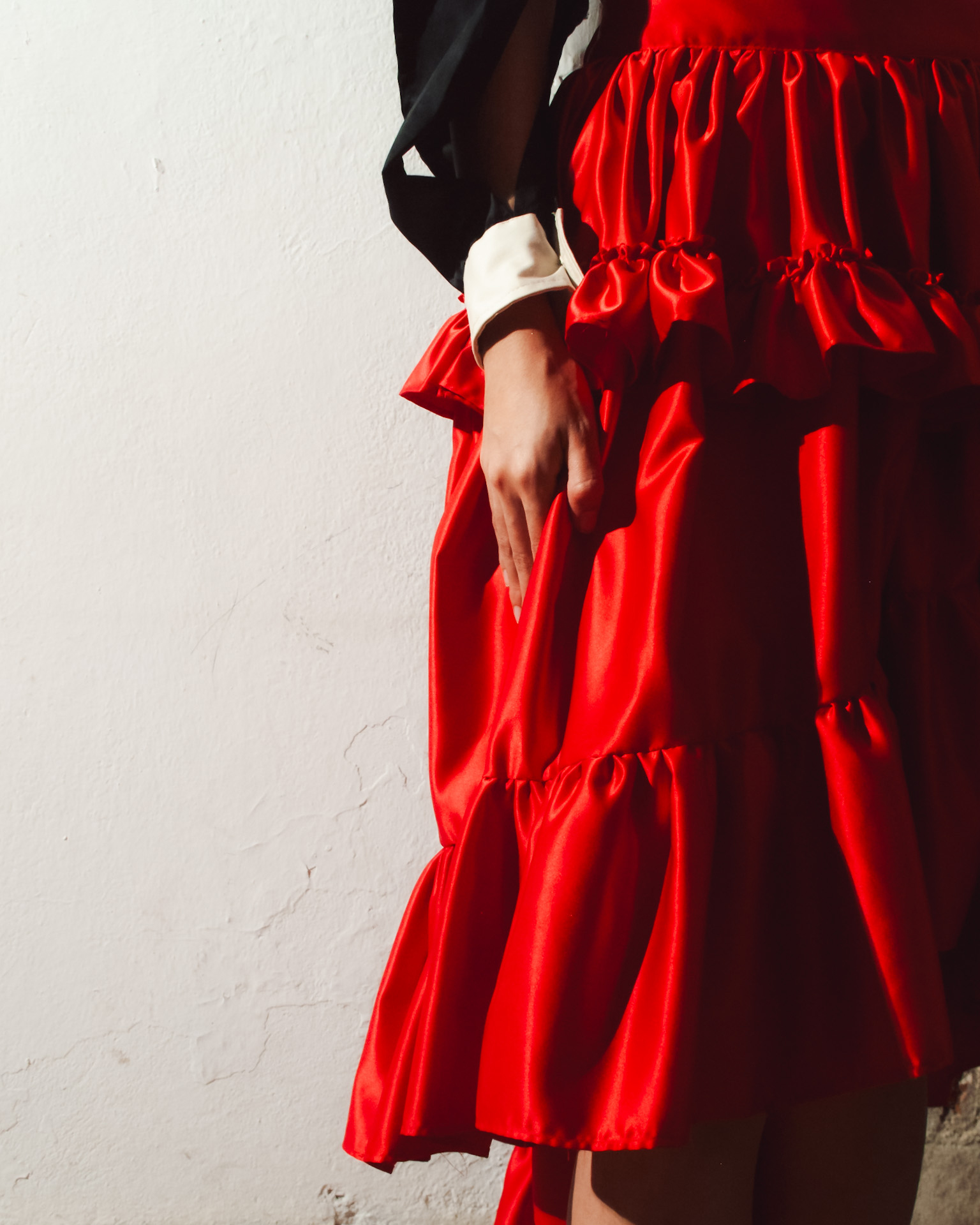 Falda hecha de razo en color rojo, con diferentes de olanes que permiten una caída espectacular. Lleva elastico en la cintura para ajustar. Largo de 50 cms de la parte más corta.