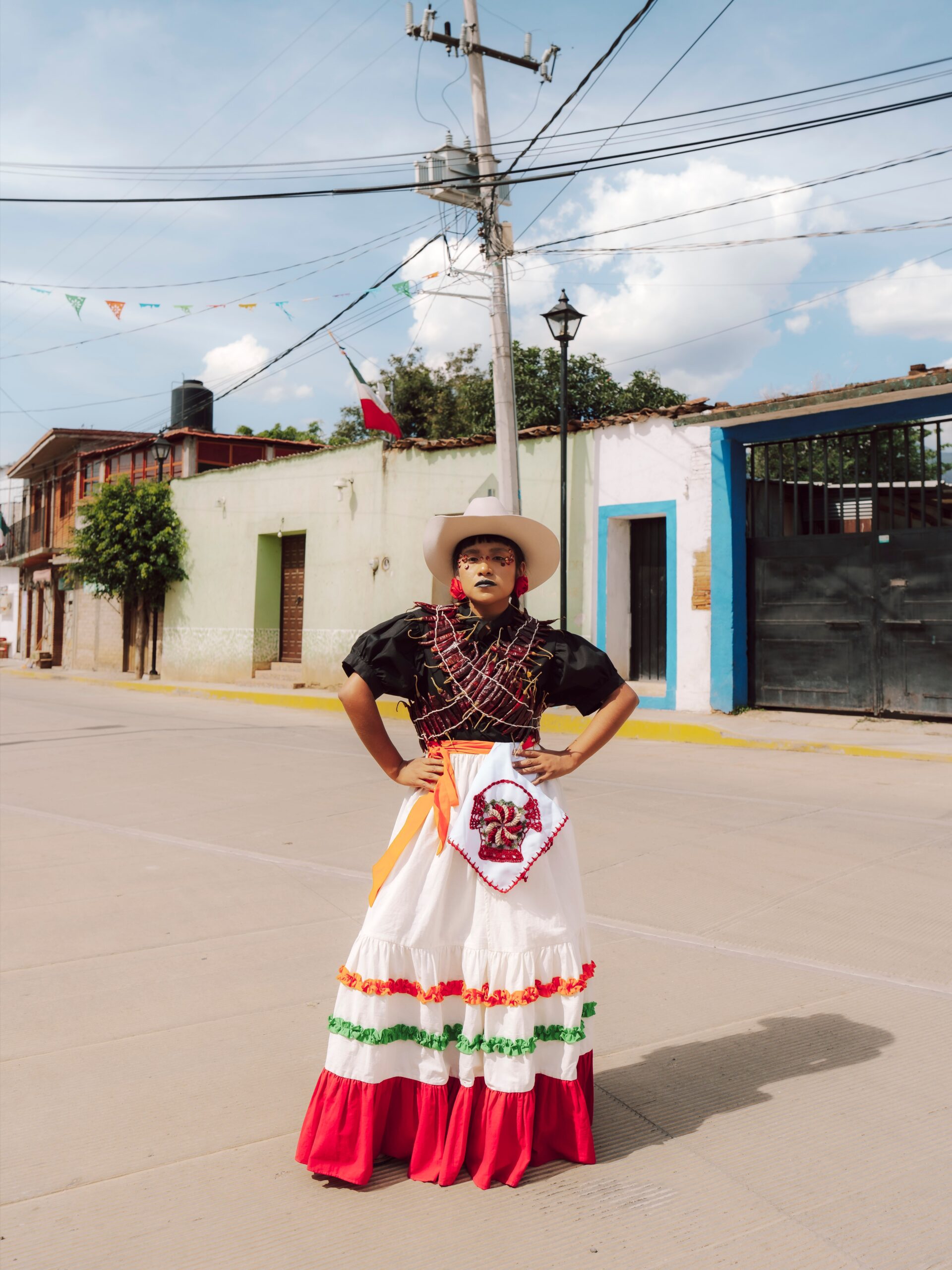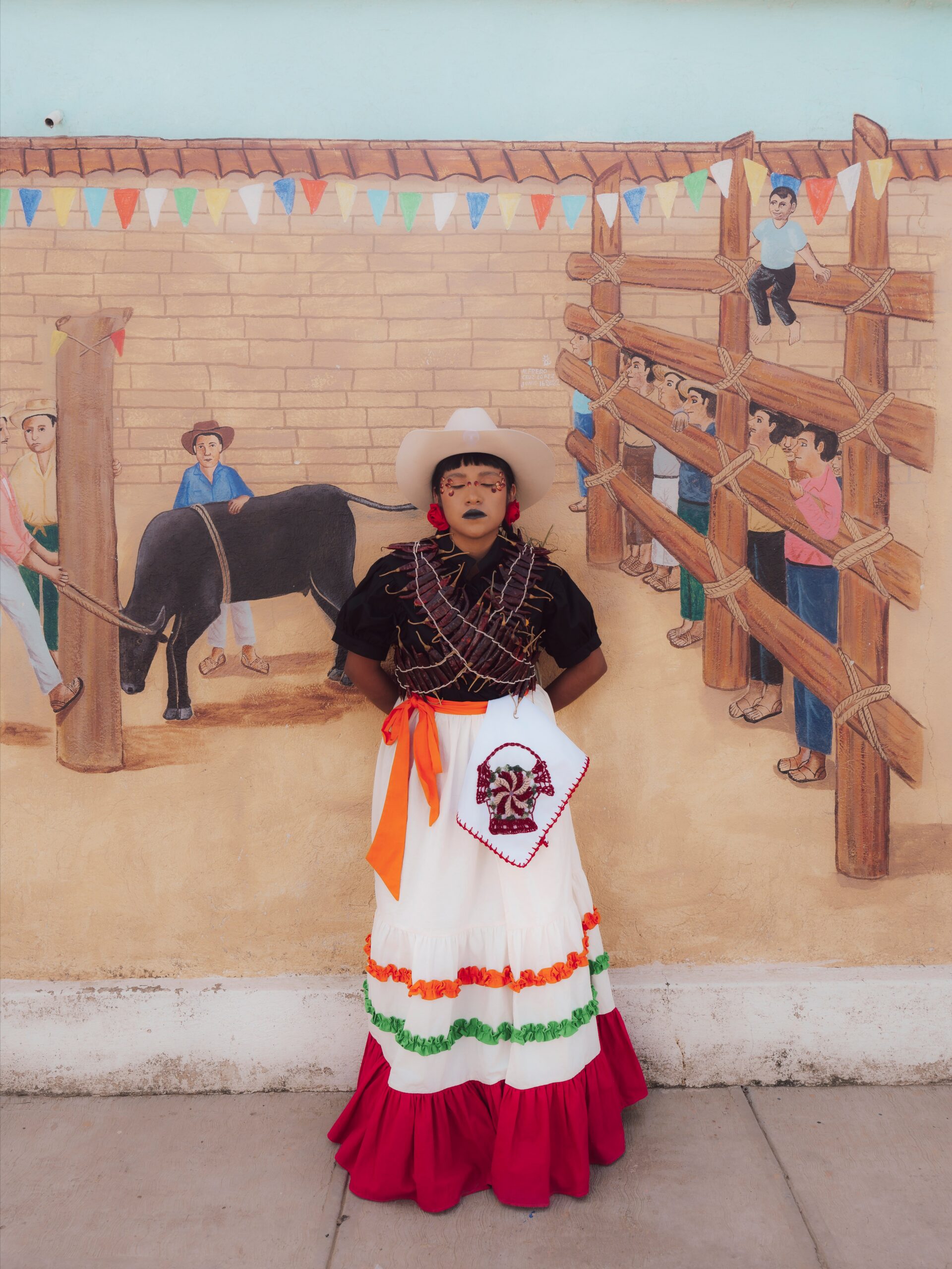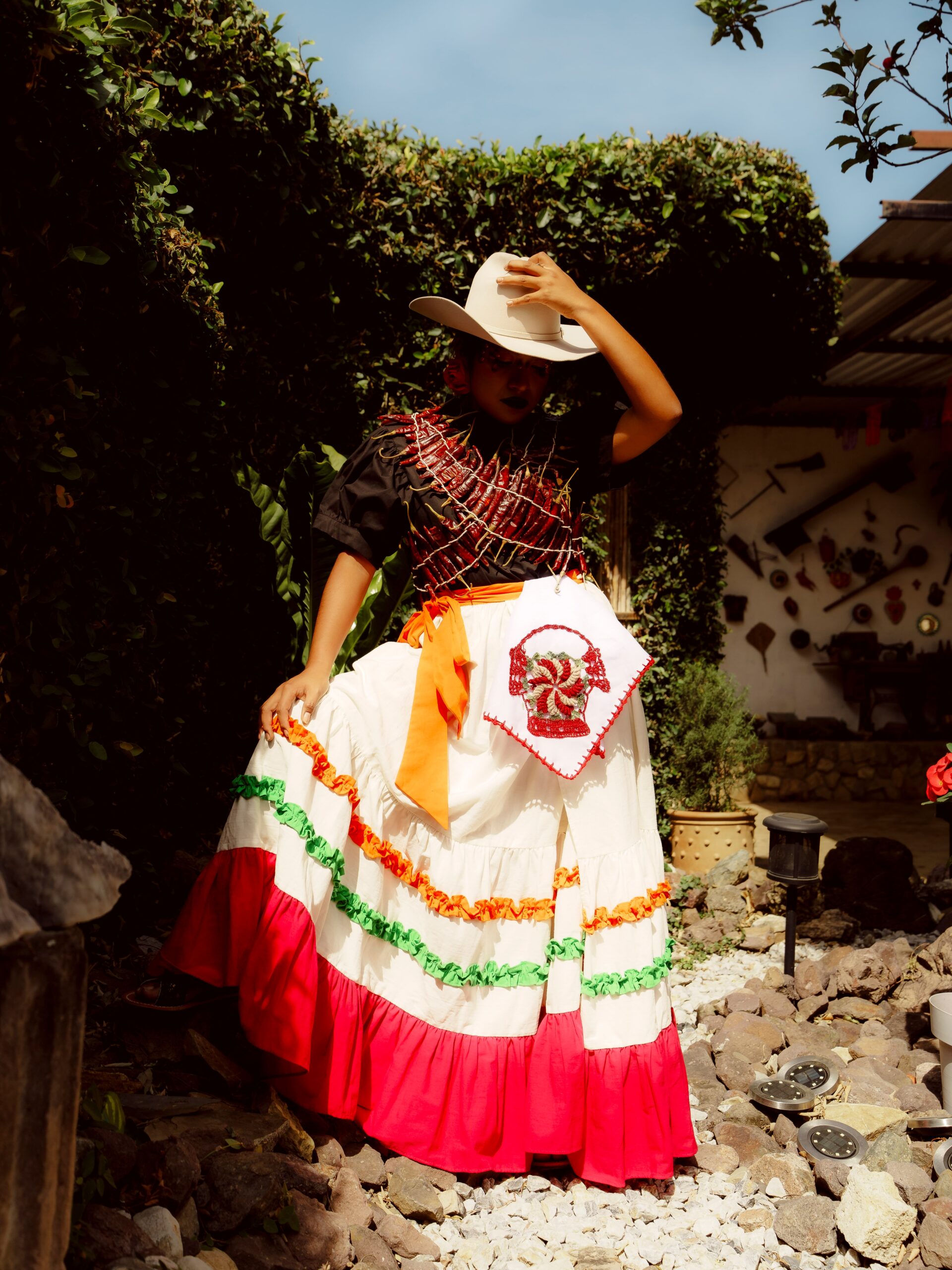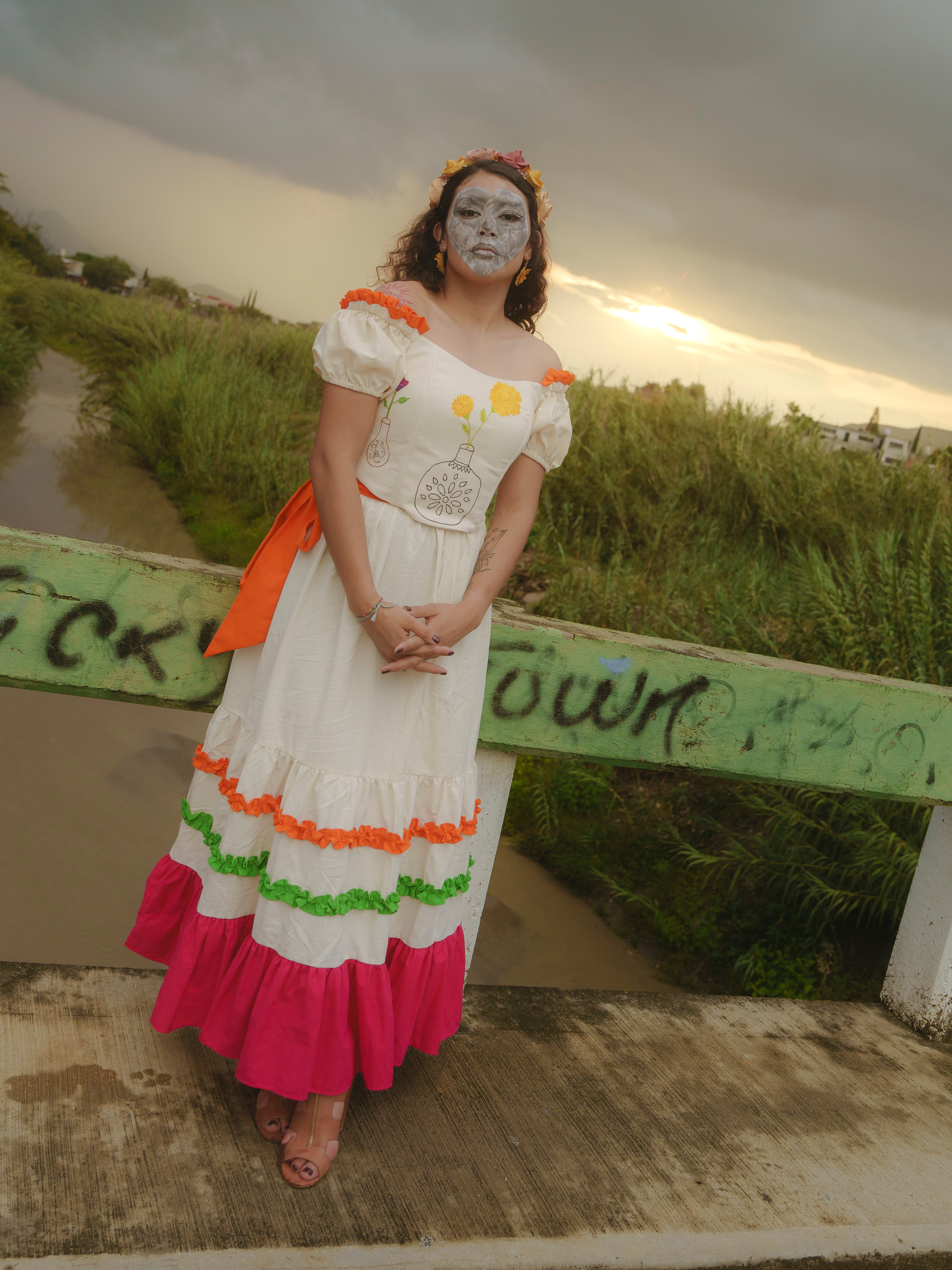 Falda envolvente hecha de algodón, con dos olanes delgados (uno naranja y uno verde) y un olan grande color rosa al final. Se ajusta con correas que se amarran a los costados.