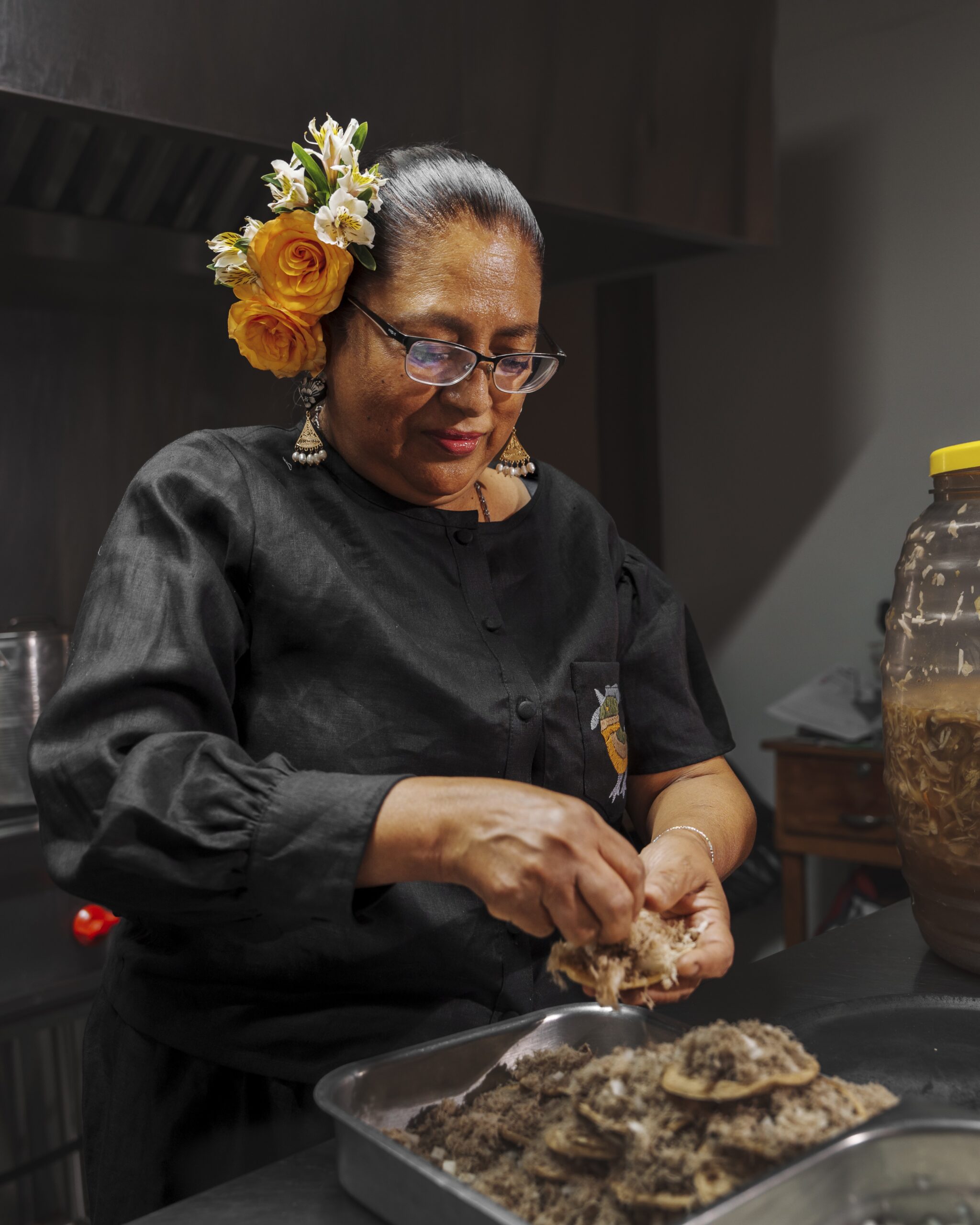 Blusa hecha de lino algodón con mangas asimétricas, donde una es larga y la otra corta con olán; al centro lleva cruce de botones forrados y una bolsa con un gallo bordado en técnica de Huazolo.
