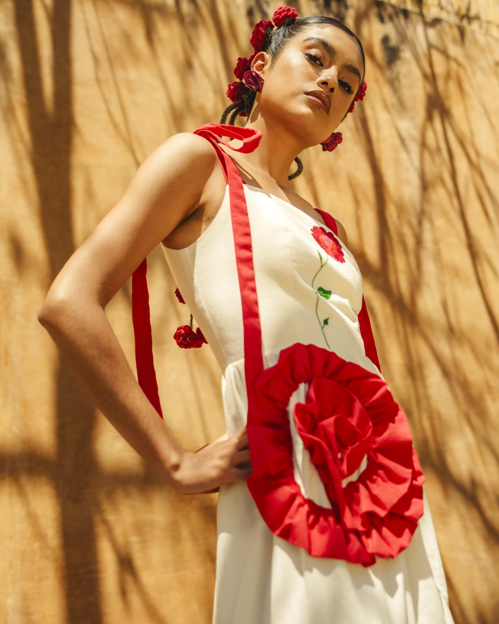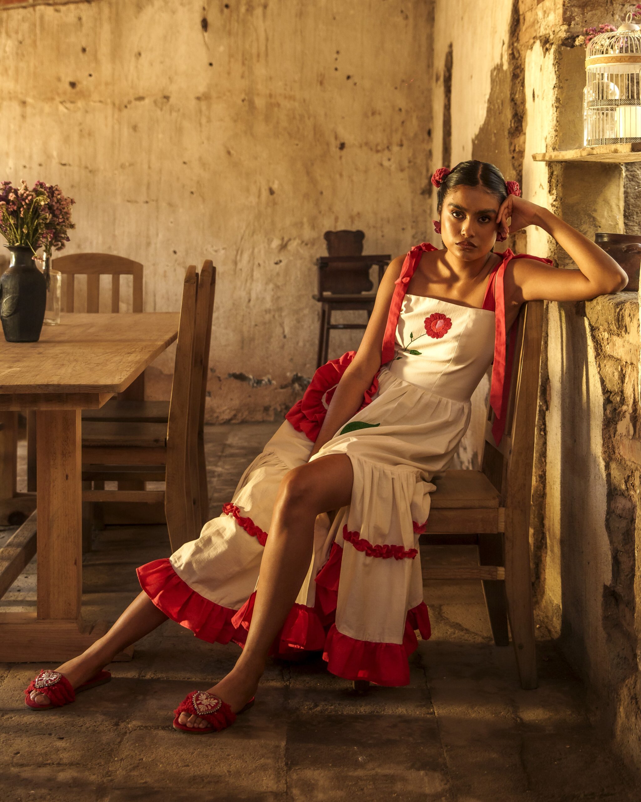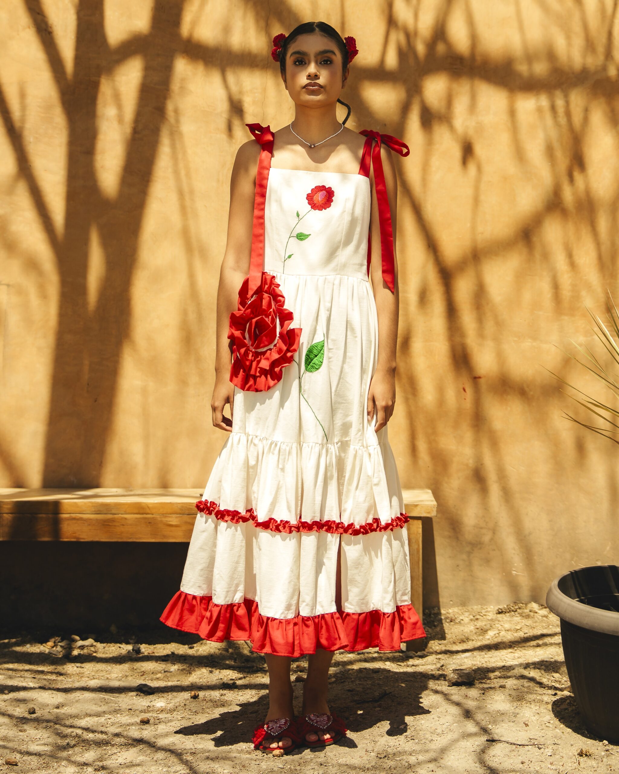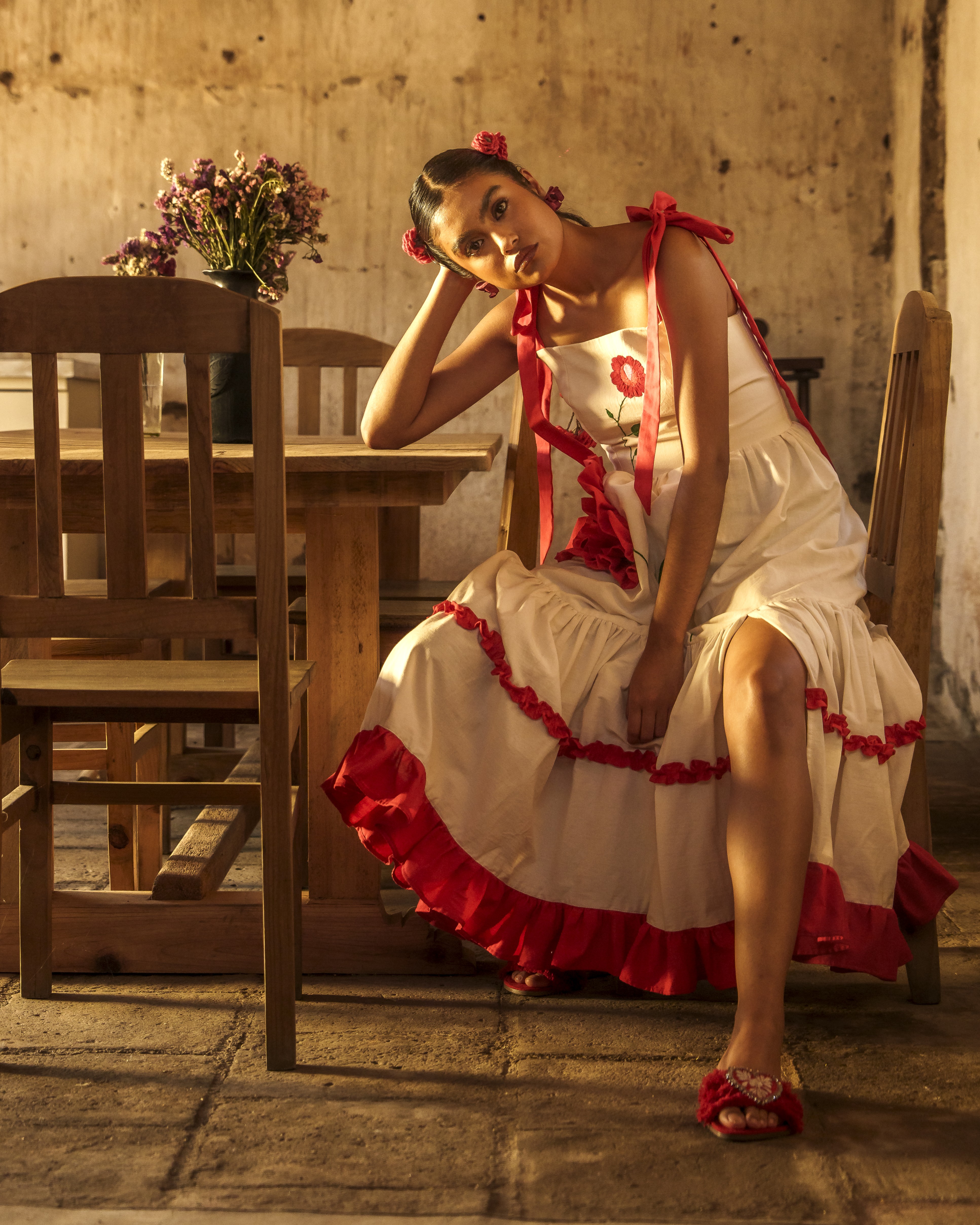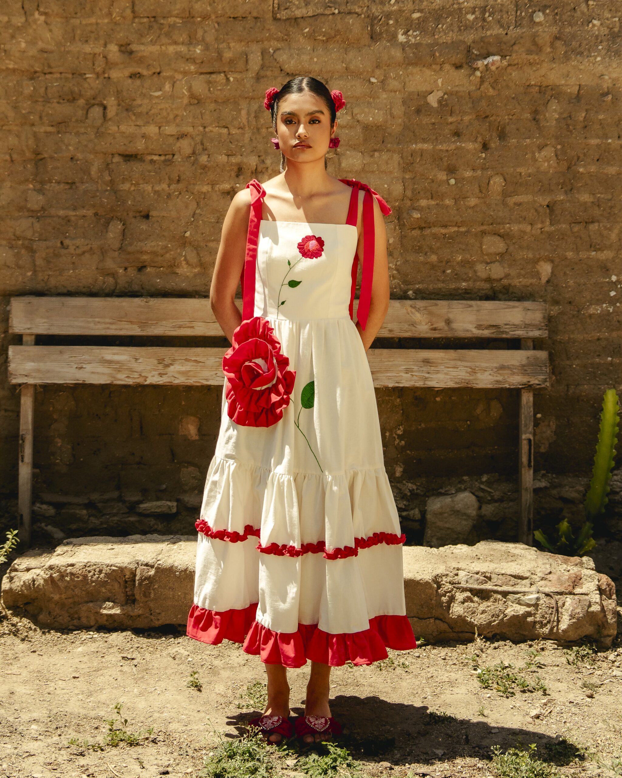 Hecho de manta natural compuesto por un bustier en el cual se borda una rosa en técnica de pata de gallo y cadenita y una falda con un olan rojo que forma una segunda flor y un bordado que simulan su rama, al final de la falda dos olanes plisado y una abertura al costado. El vestido se sujeta con dos correas para formar un moño.
