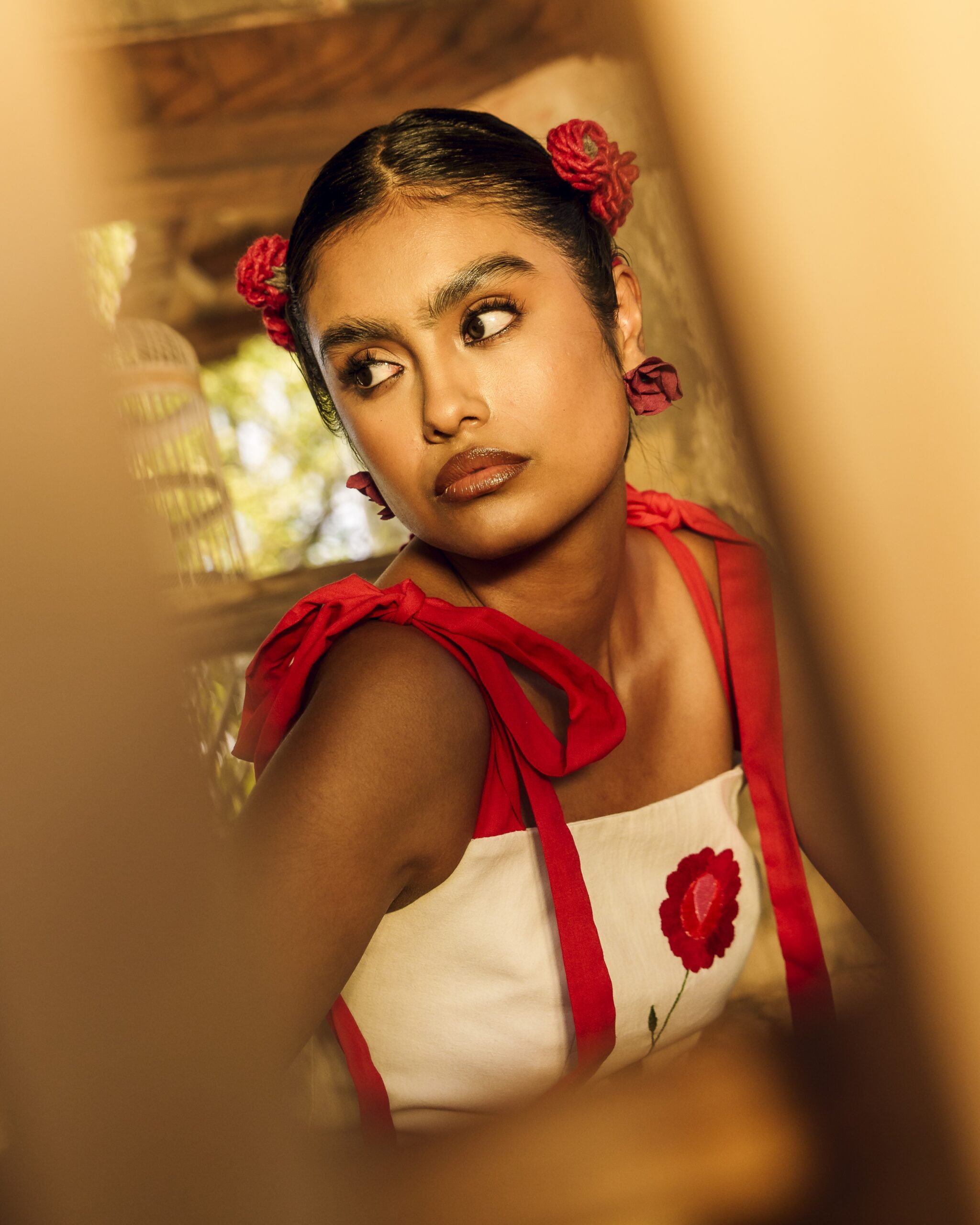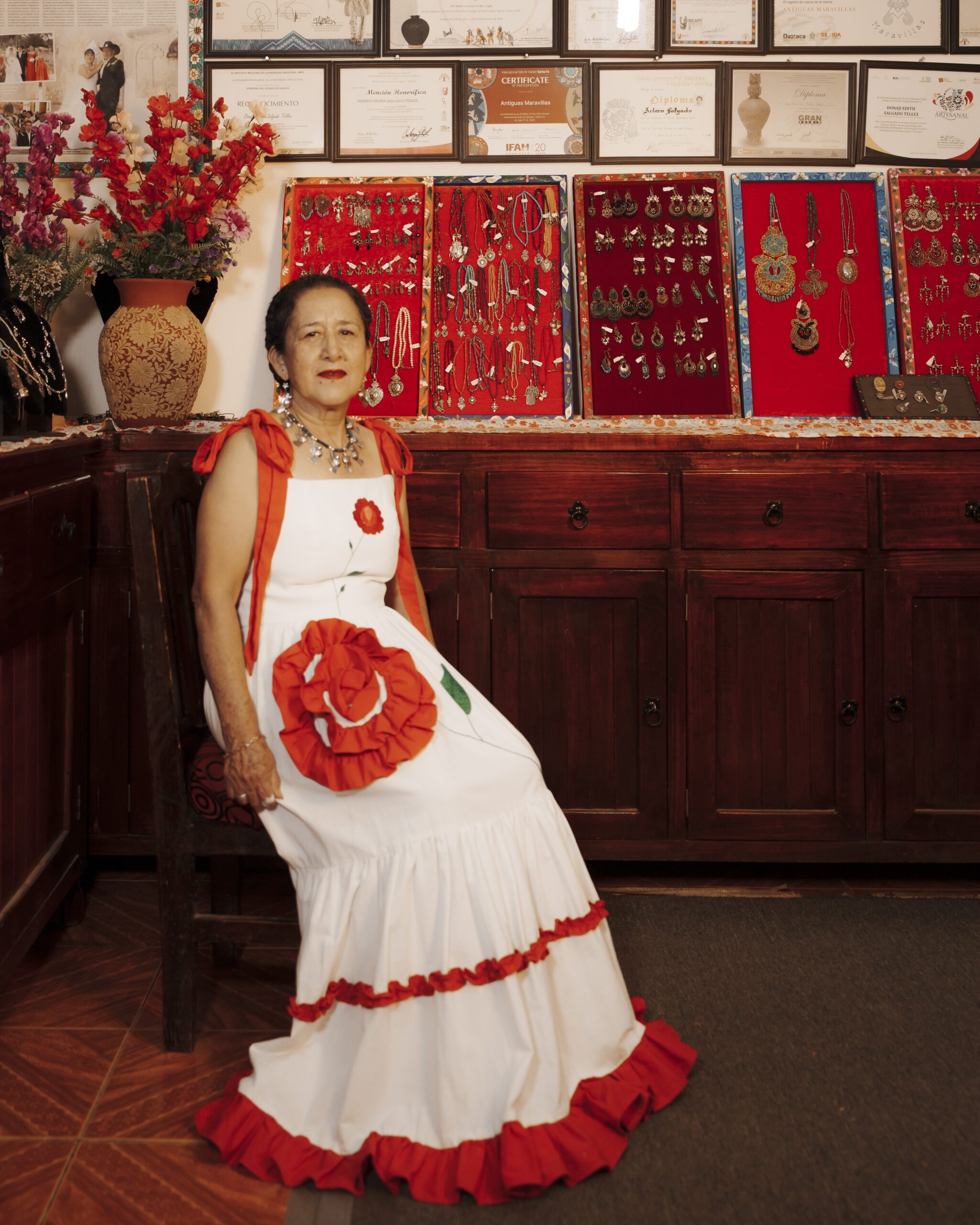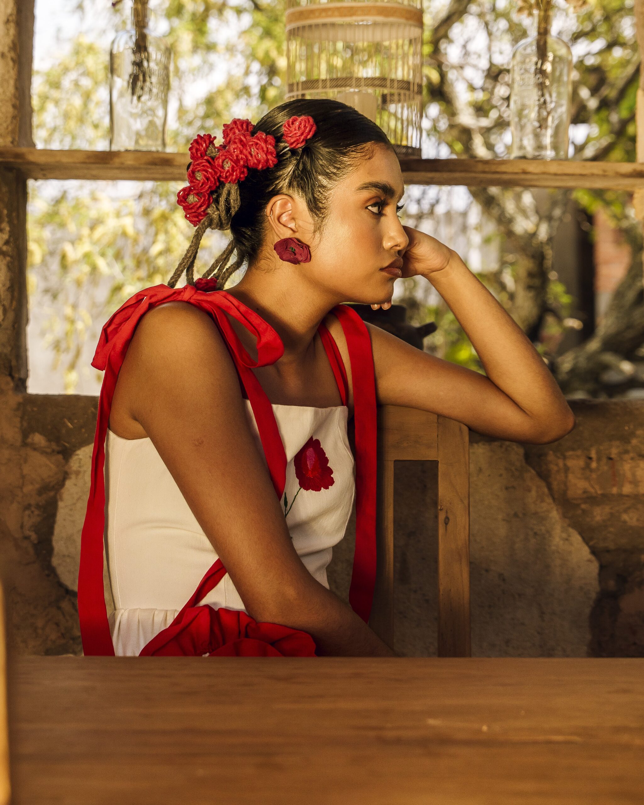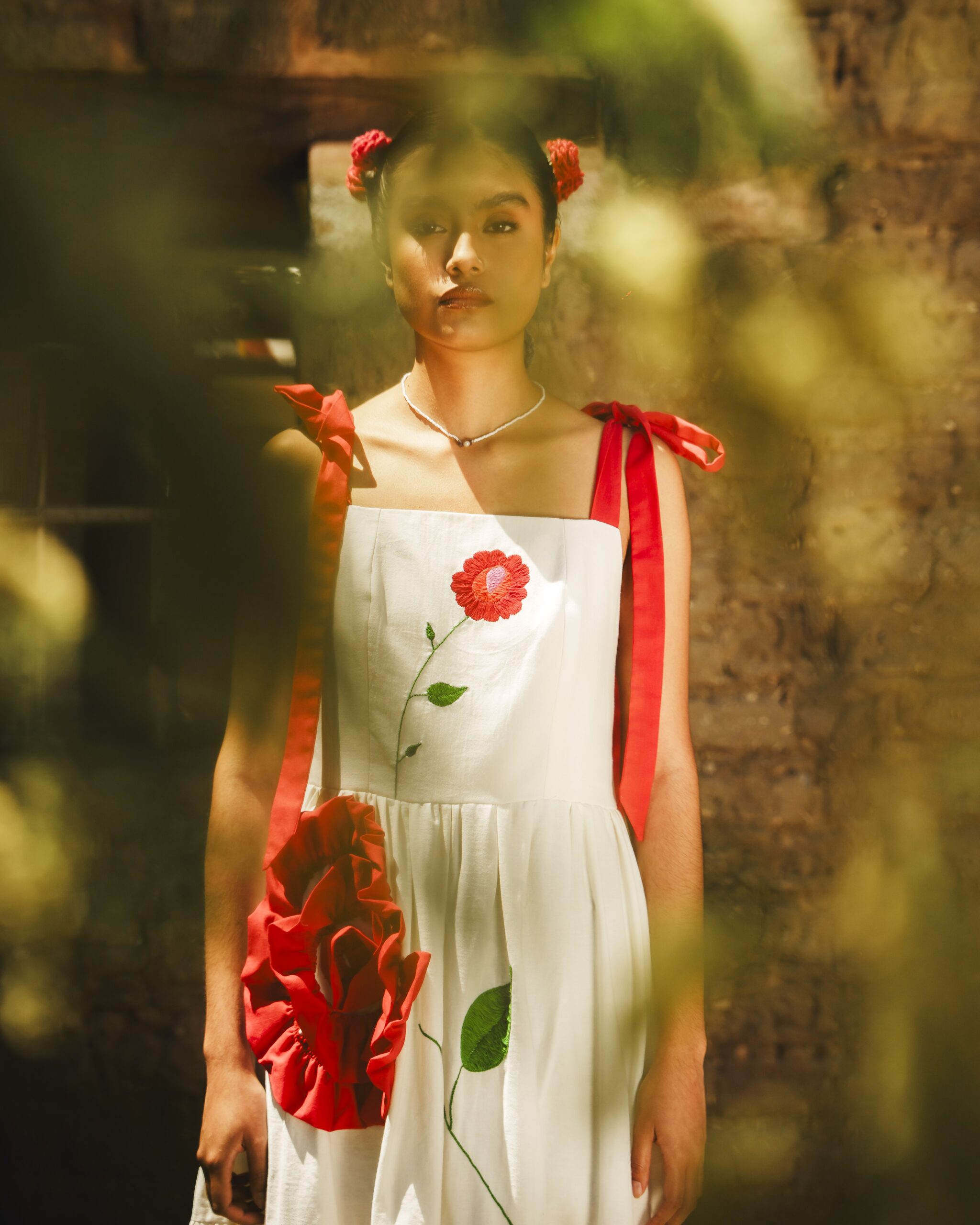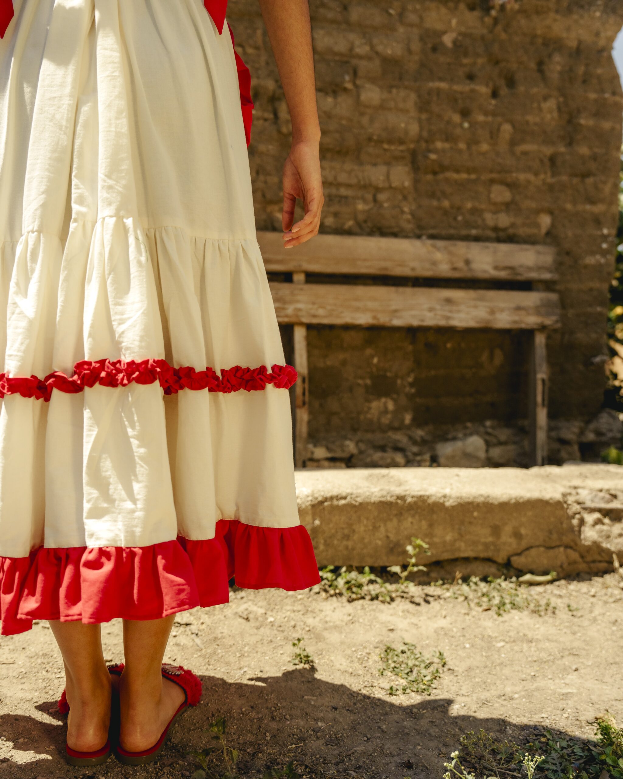 Hecho de manta natural compuesto por un bustier en el cual se borda una rosa en técnica de pata de gallo y cadenita y una falda con un olan rojo que forma una segunda flor y un bordado que simulan su rama, al final de la falda dos olanes plisado y una abertura al costado. El vestido se sujeta con dos correas para formar un moño.