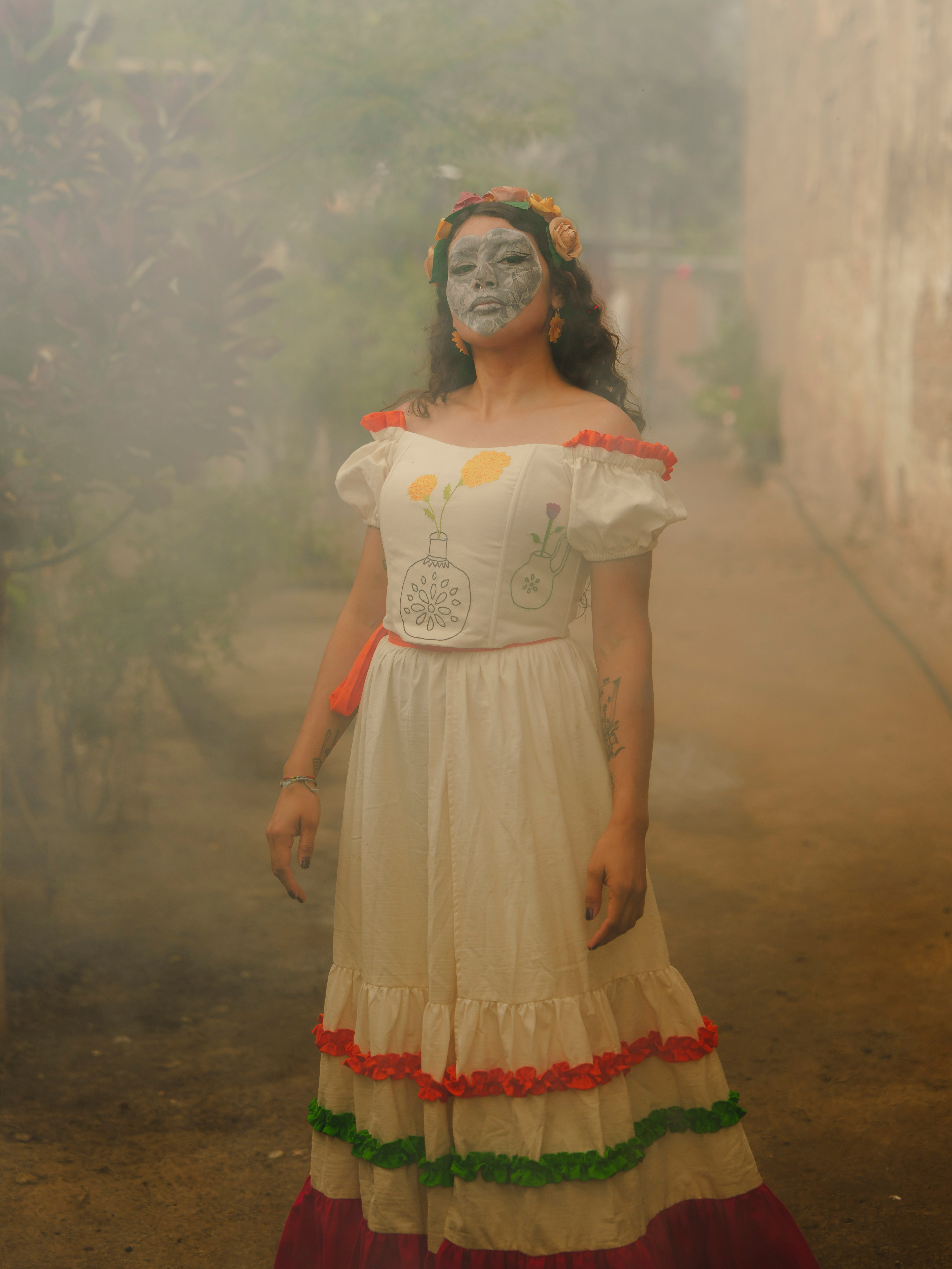 Vestido compuesto por un corset hecho de manta natural, en el cual se bordan tres floreros de barro cada uno con una flor de cempasúchil o flor de terciopelo en técnica de pata de gallo y cadenita; con mangas campesinas, las cuales tienen un detalle con olan naranja y una falda envolvente con dos olanes delgados (uno naranja y uno verde) y un olan grande color rosa al final. Se ajusta con correas que se amarran a los costados.