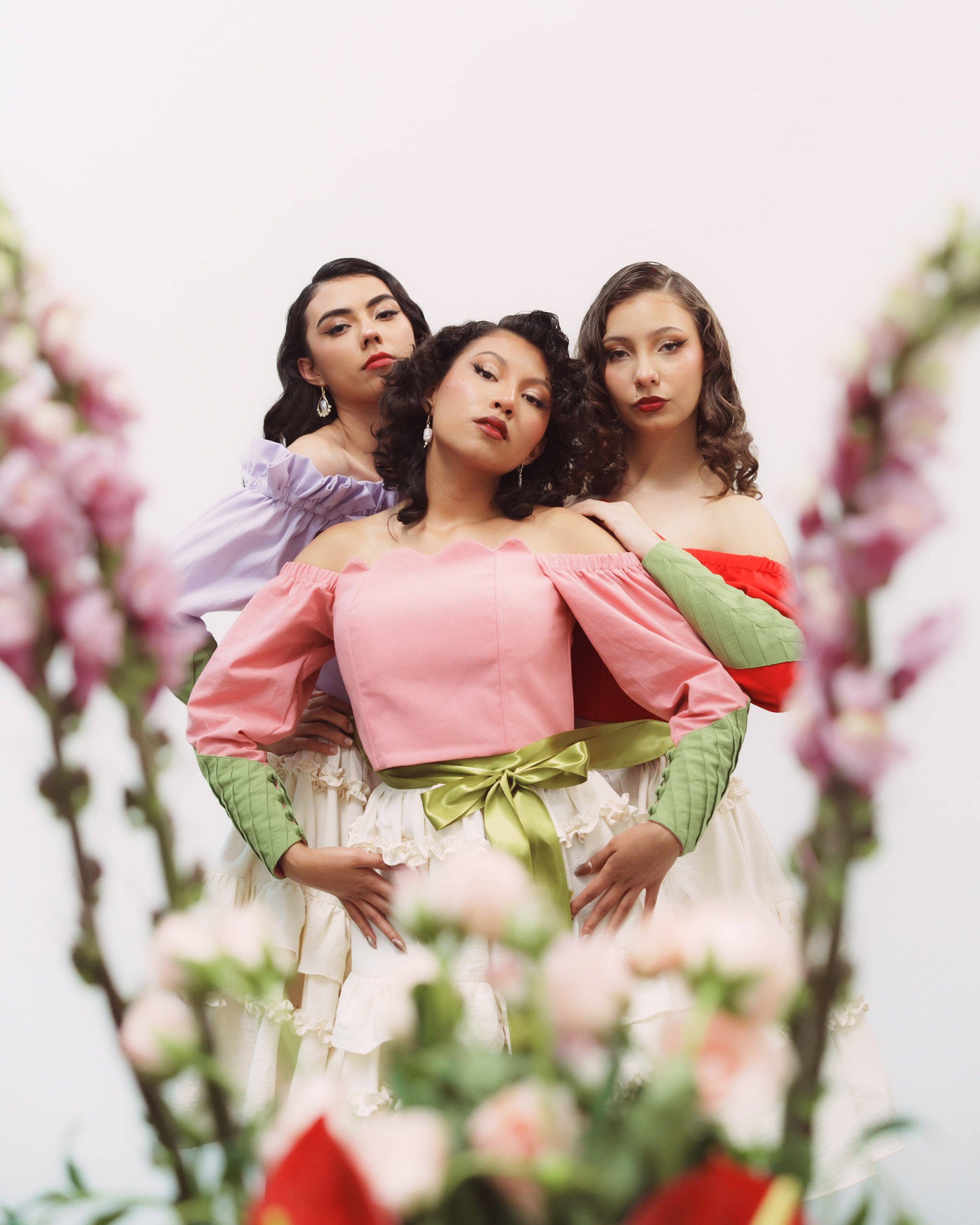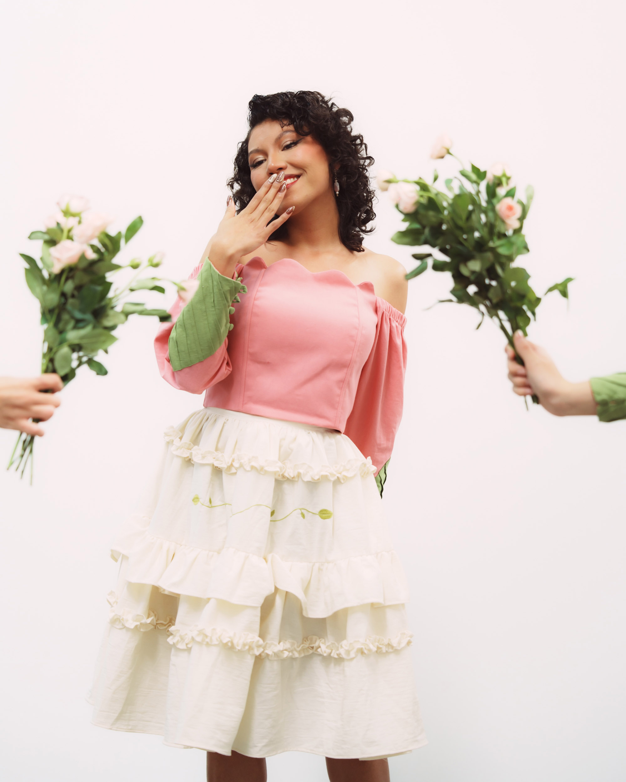 Vestido compuesto por un corset hecho de manta de algodón en color rosa, rojo o lila, con inspiración en distintas flores, y nuestras alforzas distintivas en las mangas en color verde que simulan una hoja y una falda hecha de manta de algodón en color natural, con detalles de olanes y plisado. Al centro se borda una rama en cadenita. Falda larga de 60 cms.