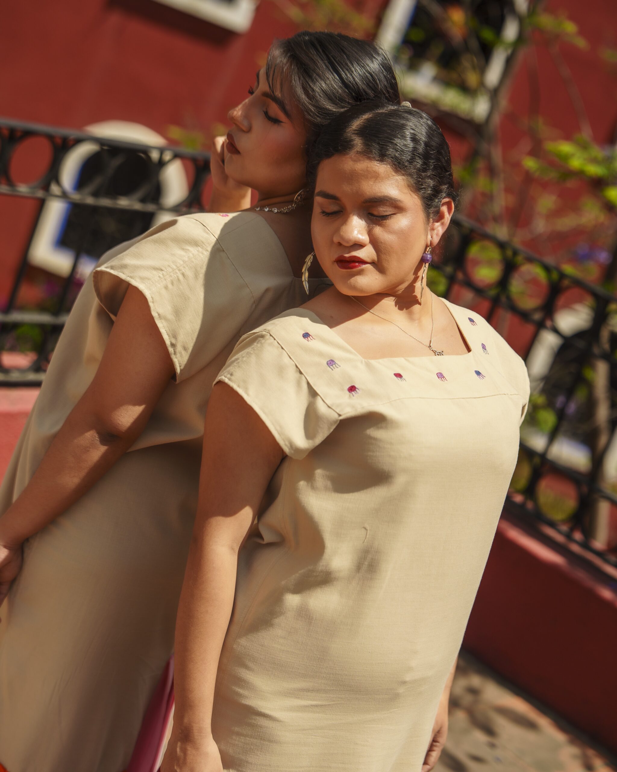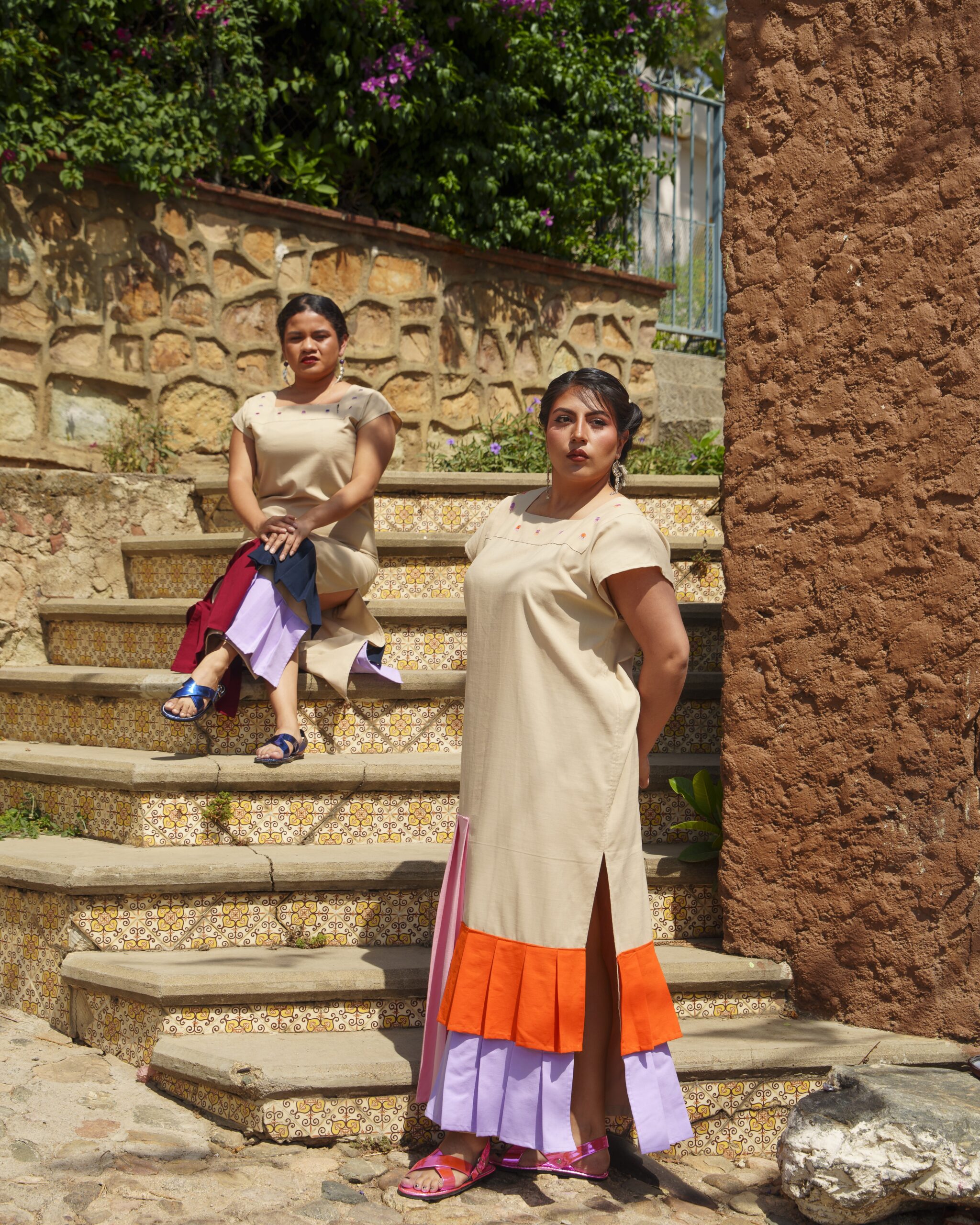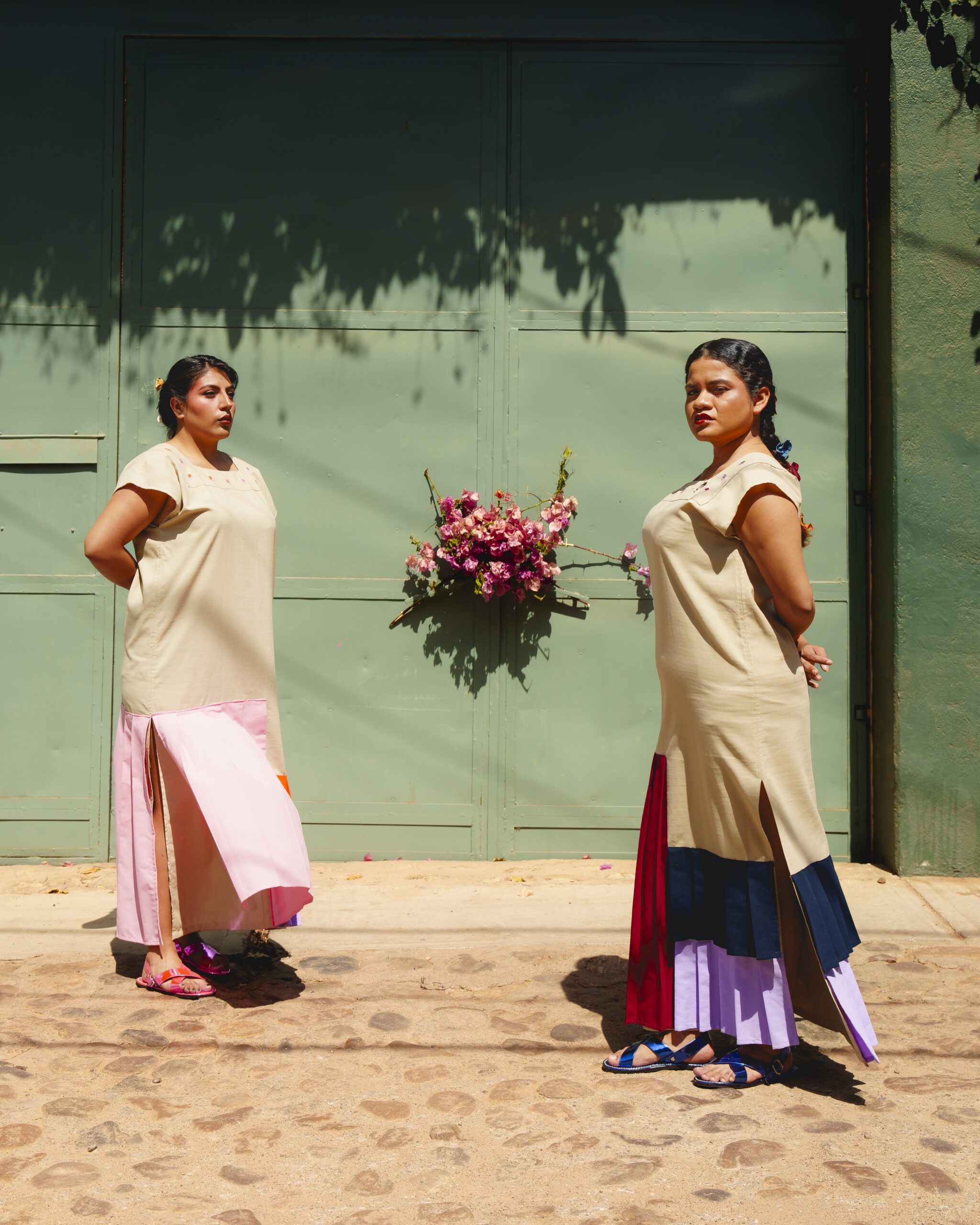 Vestido recto con olanes asimétricos en tres colores. Cuenta con abertura a los costados, un escote cuadrado con una pieza calcada y bordado con motivos de medusa.